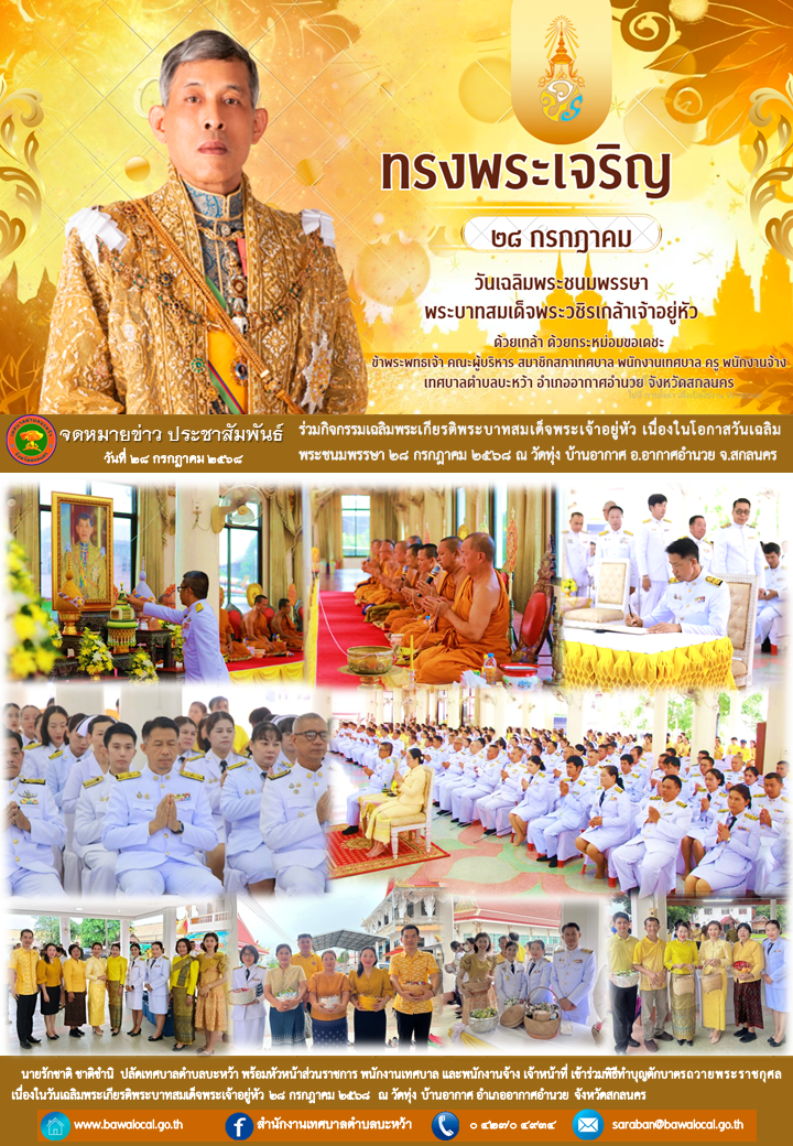 รายละเอียด : นายรักชาติ ชาติชำนิ ปลัดเทศบาลตำบลบะหว้า พร้อมหัวหน้าส่วนราชการ พนักงานเทศบาล และพนักงานจ้าง เจ้าหน้าที่ เข้าร่วมพิธีทำบุญตักบาตรถวายพระราชกุศล เนื่องในวันเฉลิมพระเกียรติพระบาทสมเด็จพระเจ้าอยู่หัว 28 กรกฎาคม 2568 ณ วัดทุ่ง บ้านอากาศ อำเภออากาศอำนวย จังหวัดสกลนคร