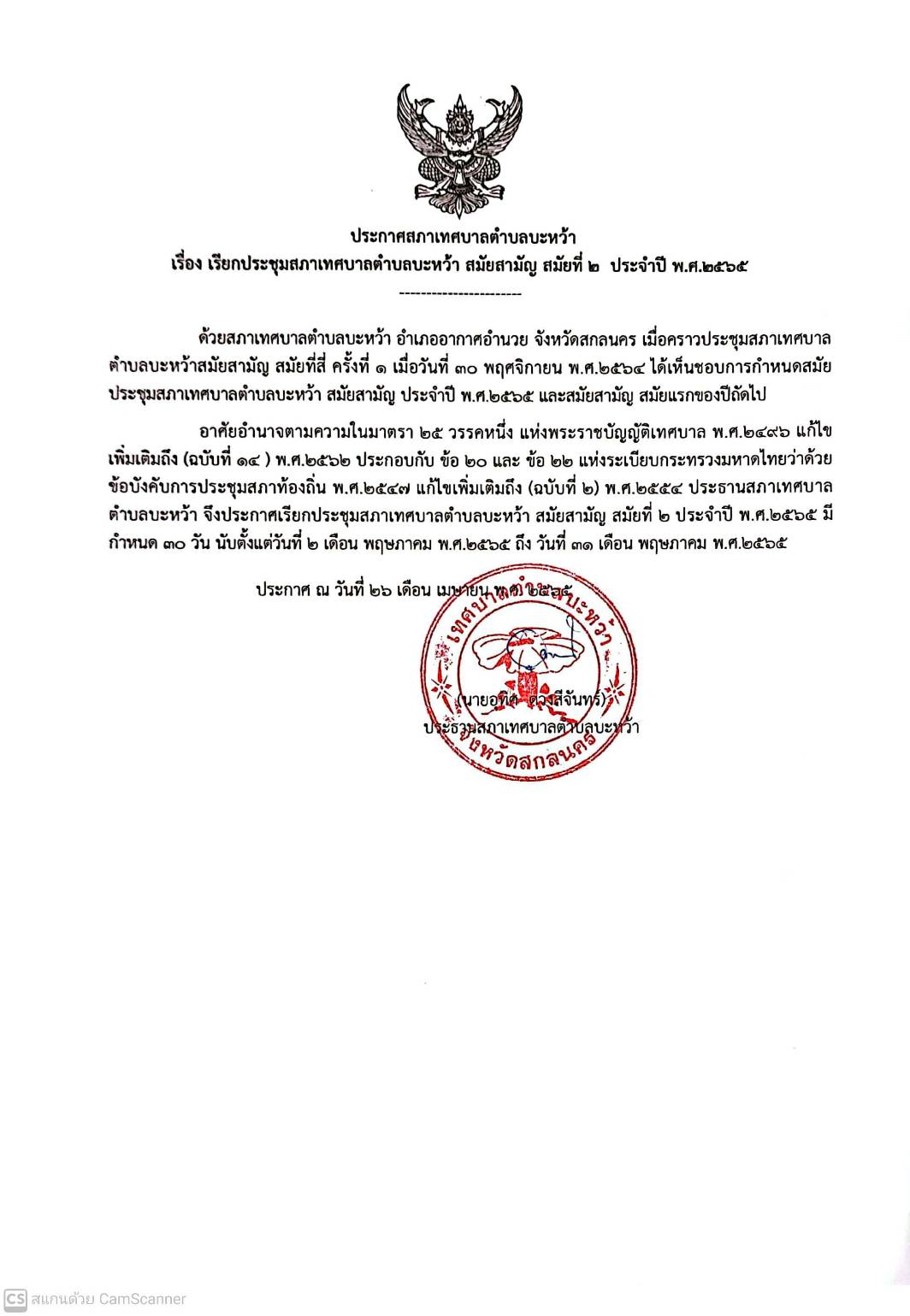 ประกาศสภาเทศบาลตำบลบะหว้า เรื่อง เรียกประชุมสภาเทศบาลตำบลบะหว้า สมัยสามัญ สมัยที่ 2 ประจำปี พ.ศ.2565