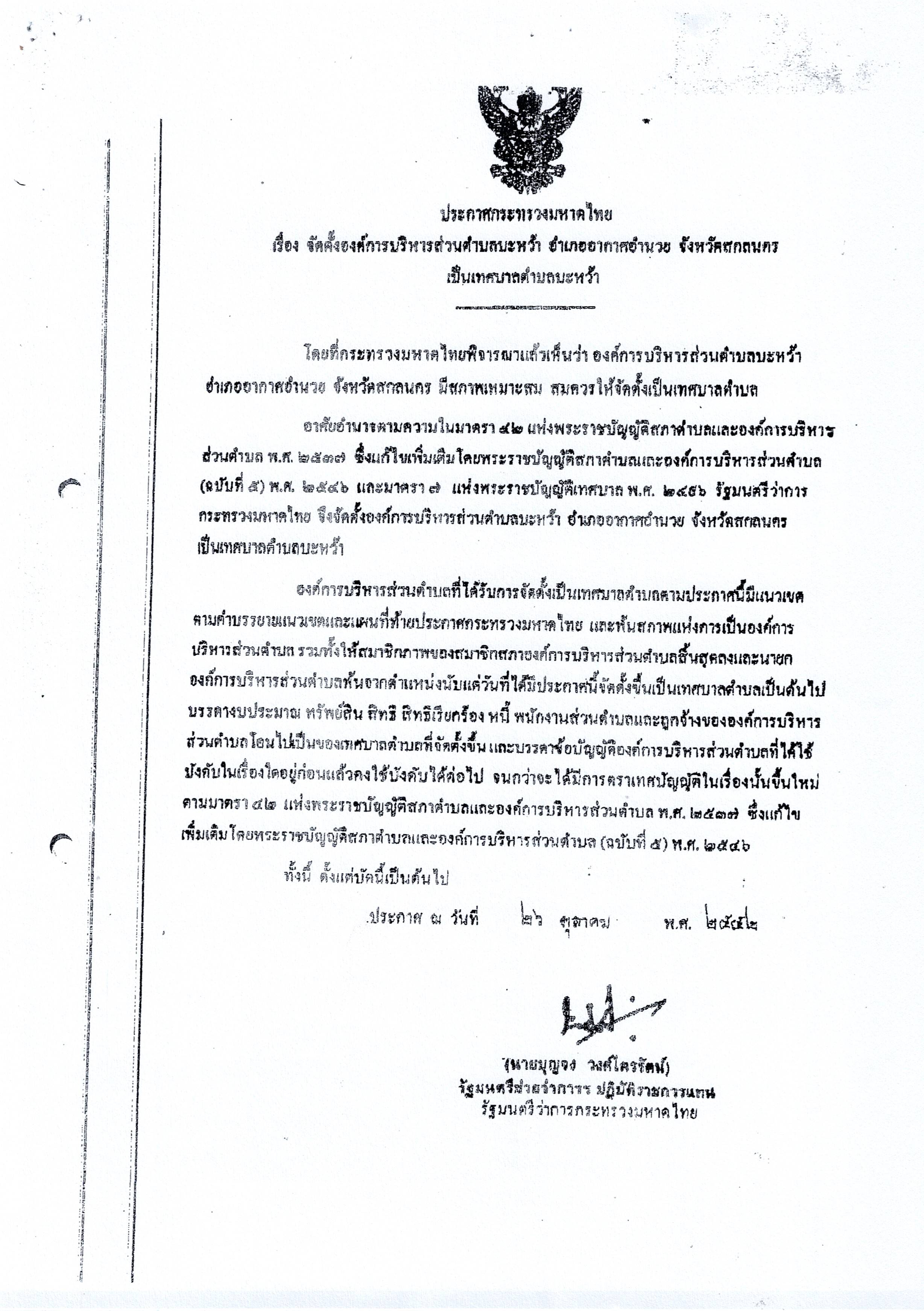 ประกาศกระทรวงมหาดไทย เรื่องจัดตั้งองค์การบริหารส่วนตำบลบะหว้าอำเภออากาศอำนวย จังหวัดสกลนครเป็นเทศบาลตำบลบะหว้า
